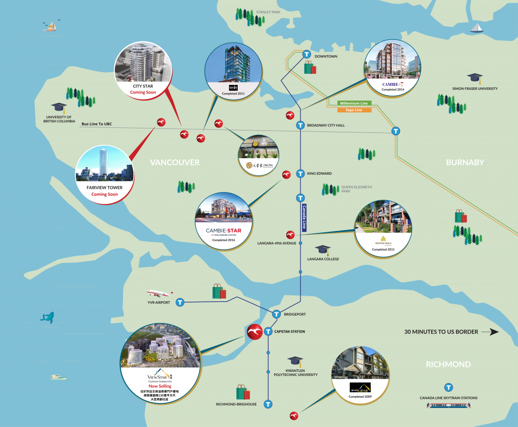 元亨控股开发项目— “ViewStar郡苑” 是列治文目前最大规模最为成熟水岸综合社区型小区,位门户地段交通畅达,周边商业环伺。由12栋华厦组成130万平方尺,其中南区6栋577套住宅(Phase I)一体成型,空中花园面积超6.5万平方尺;北区4栋(Phase II)由2栋住宅274套住宅,1栋写字楼(20万平方尺),1栋社区中心(3.5万平方尺),空中花园面积超3.5万平方尺;西区(Phase III)2栋临河住宅83套住宅,临河花园面积超5万平方尺。临3号路商业自持确保 “住家” 品质,Phase I 配有恒温泳池,Phase II 配有社区中心,Phase III 配有恒温泳池,距温哥华西区学校仅一桥之隔等。